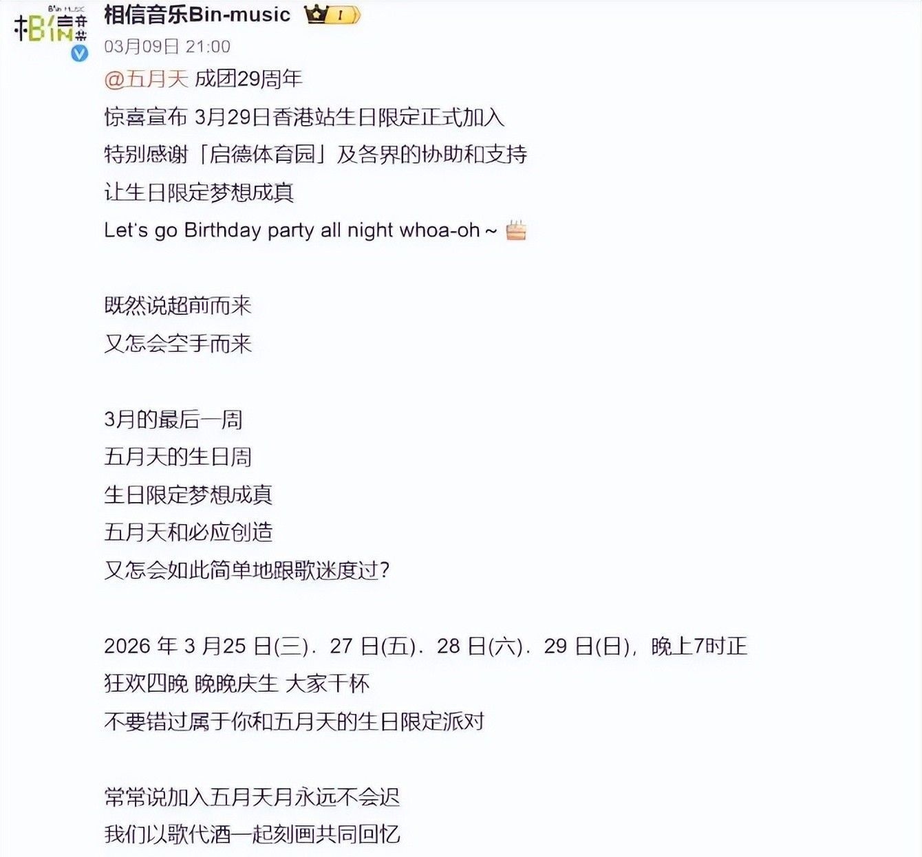 3月9日晚间,五月天所属经纪公司突兀发布通告,宣布原定3月24日举行的香港站演出正式取消。